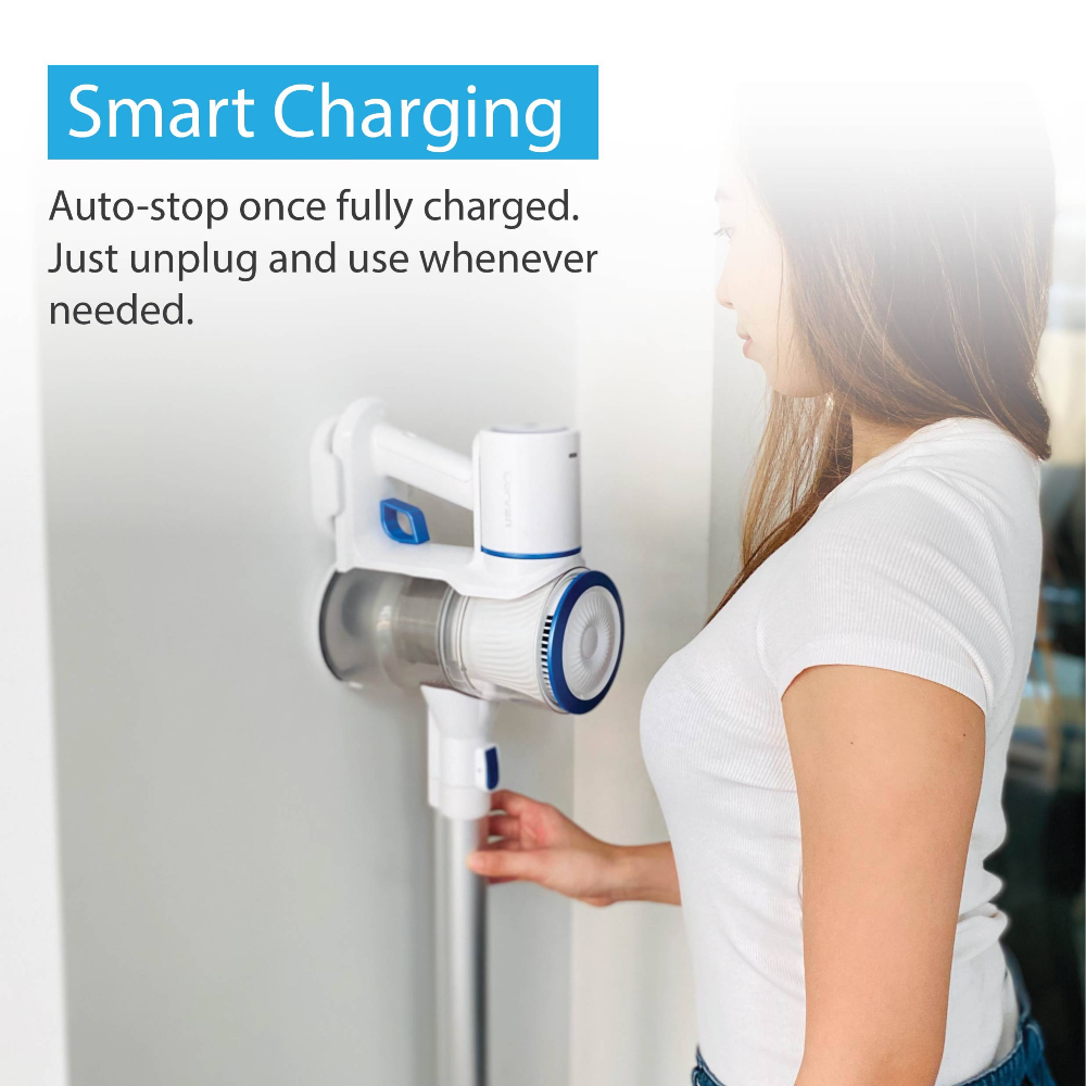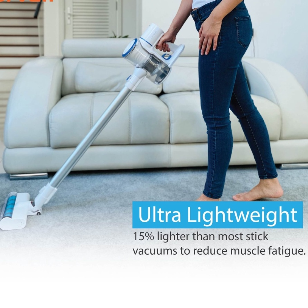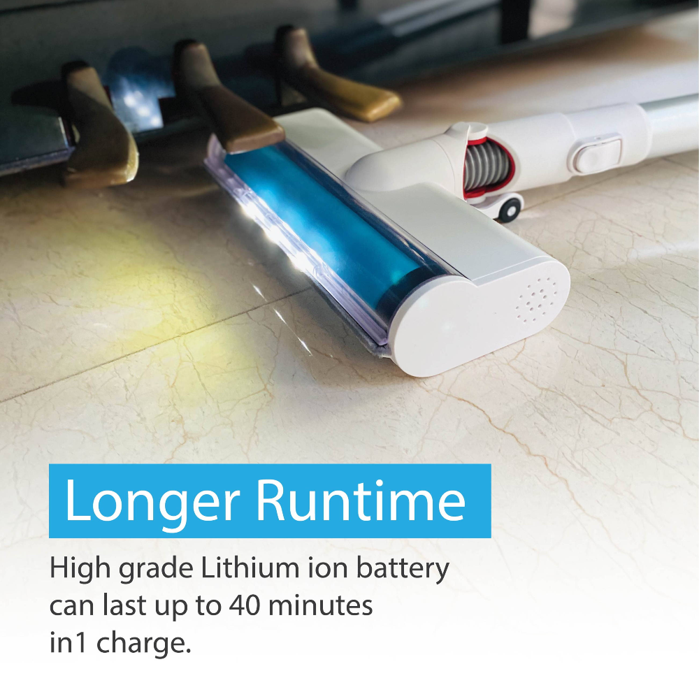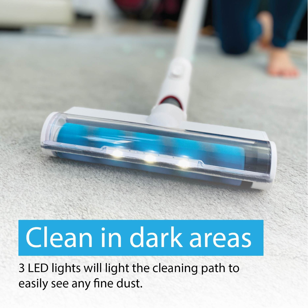 Ultra-lightweight body with ultra-strong suction, anti-tangled motor brush with LED lights targeting cleaning path, long runtime for large space cleaning, extra-long 65cm extension rod, fully-charged-auto-stop smart charging, wall mounted bracket for convenient charging and easy storage.