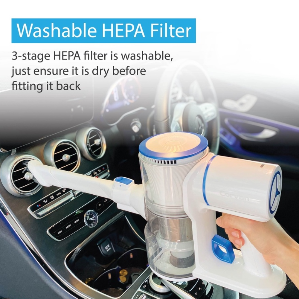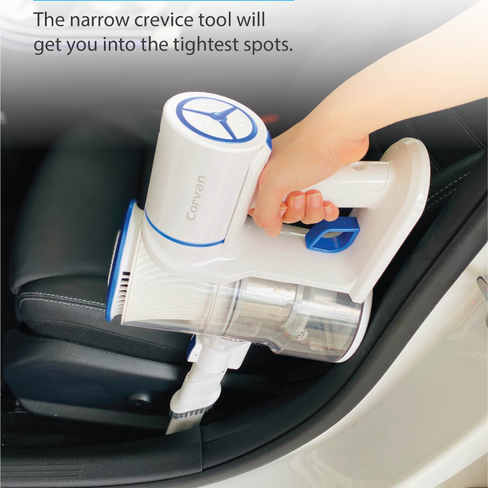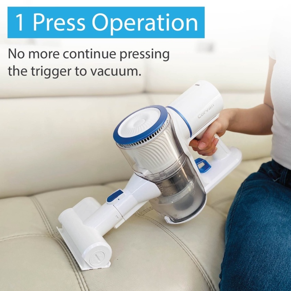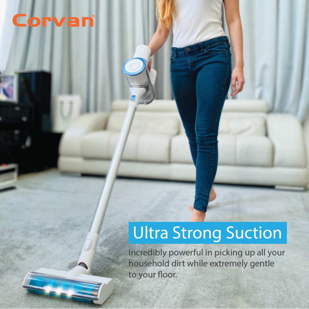Ultra-lightweight body with ultra-strong suction, anti-tangled motor brush with LED lights targeting cleaning path, long runtime for large space cleaning, extra-long 65cm extension rod, fully-charged-auto-stop smart charging, wall mounted bracket for convenient charging and easy storage.